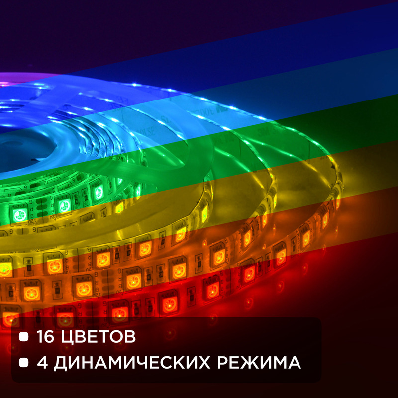 В состав готового комплекта с артикулом 10-35 входит 5 метров светодиодной ленты, которая работает от постоянного тока с напряжением 12В. Благодаря светодиодам smd 5050 излучающим световой поток равный 700 Лм/м* лента является прекрасным решением для организации основного освещения и ярких декоративных подсветок. Она подойдет для создания основного освещения на базе многоуровневых потолков, а также будет отличным выбором для освещения торгового оборудования или требующих большой яркости рекламных вывесок. По сравнению с лампами накаливания светодиодная лента эквивалентна лампам мощностью 70 Вт. Данная модель светодиодной ленты является многоцветной. Каждый светодиод такой ленты имеет 3 базовых цвета: синий, зеленый и красный. В зависимости от используемого контроллера можно получить до 256 различных оттенков свечения. Также в состав комплекта входит адаптер питания с проводом и вилкой в розетку с одной стороны и провод с выключателем и коннектором стандарта 5,5х2,1 для подключения светодиодной ленты, с другой стороны. Степень защиты такого адаптера соответствует стандарту IP44 и допускает установку во влажных местах, но в то же время должна сохраниться защита от прямого попадания воды. Степень защиты светодиодной ленты соответствует стандарту IP65, что позволяет использование не только во влажных помещениях, но и на улице. Отрезать светодиодную ленту можно в специально отмеченных местах, которые располагаются через каждые 50 мм. Компактные размеры светодиодной ленты с шириной 10 мм и основанием из гибкой, двухслойной, медной подложки дают огромное преимущество при создании любых дизайнерских фантазий. В дополнение к вышеупомянутой информации добавим, что данный комплект уже содержит в своем составе RGB контроллер с пультом, передающим сигнал по инфракрасному каналу и работающем в зоне прямой видимости.