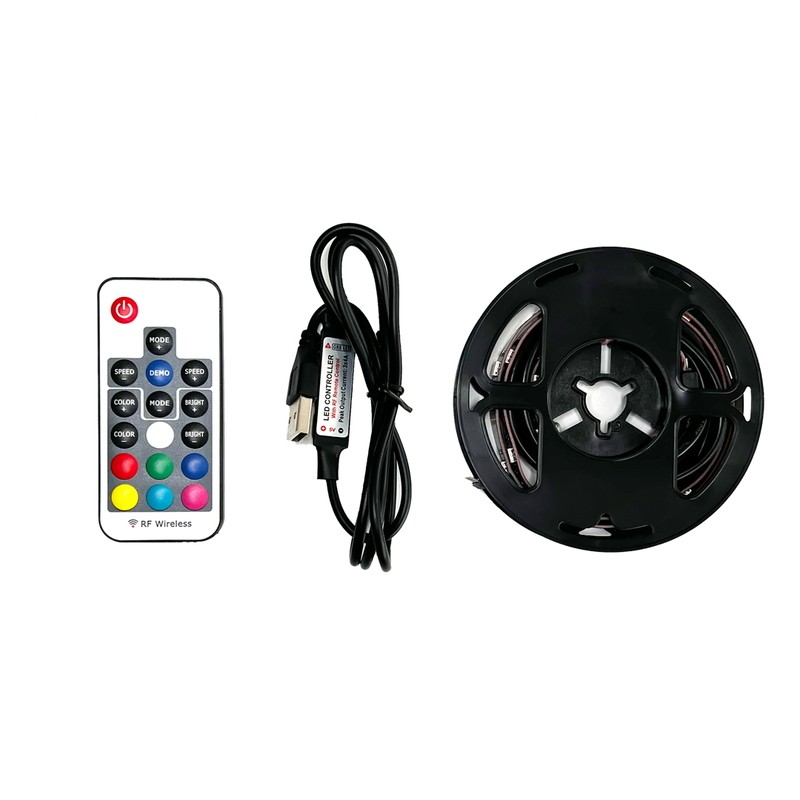 В состав готового комплекта для ТВ подсветки с артикулом 10-70 входит 2 отрезка светодиодной ленты по 0,5 метра, которая работает от постоянного тока с напряжением 5В. Благодаря светодиодам smd 5050 излучающим световой поток равный 360 Лм/м* лента является прекрасным решением для того, чтобы осуществить давнюю мечту и создать неповторимый вид вашего компьютера или телевизора. По сравнению с лампами накаливания светодиодная лента эквивалентна лампам мощностью 35 Вт. Данная модель светодиодной ленты является многоцветной. Каждый светодиод такой ленты имеет 3 базовых цвета: синий, зеленый и красный. В зависимости от используемого контроллера можно получить до 256 различных оттенков свечения. Чтобы подключить такой комплект, достаточно воткнуть USB штекер в соответствующий разъем телевизора, компьютера или ноутбука. Степень защиты светодиодной ленты соответствует стандарту IP20, что подразумевает использование только в сухих и проветриваемых помещениях. Отрезать светодиодную ленту можно в специально отмеченных местах, которые располагаются через каждые 33 мм. Компактные размеры светодиодной ленты с шириной 10 мм и основанием из гибкой, двухслойной, медной подложки дают огромное преимущество при создании любых дизайнерских фантазий. В дополнение к вышеупомянутой информации добавим, что данный комплект уже содержит в своем составе RGB контроллер с пультом, передающим сигнал по радиоканалу, который работает на дистанции до 15 метров без надобности находиться в зоне прямой видимости.